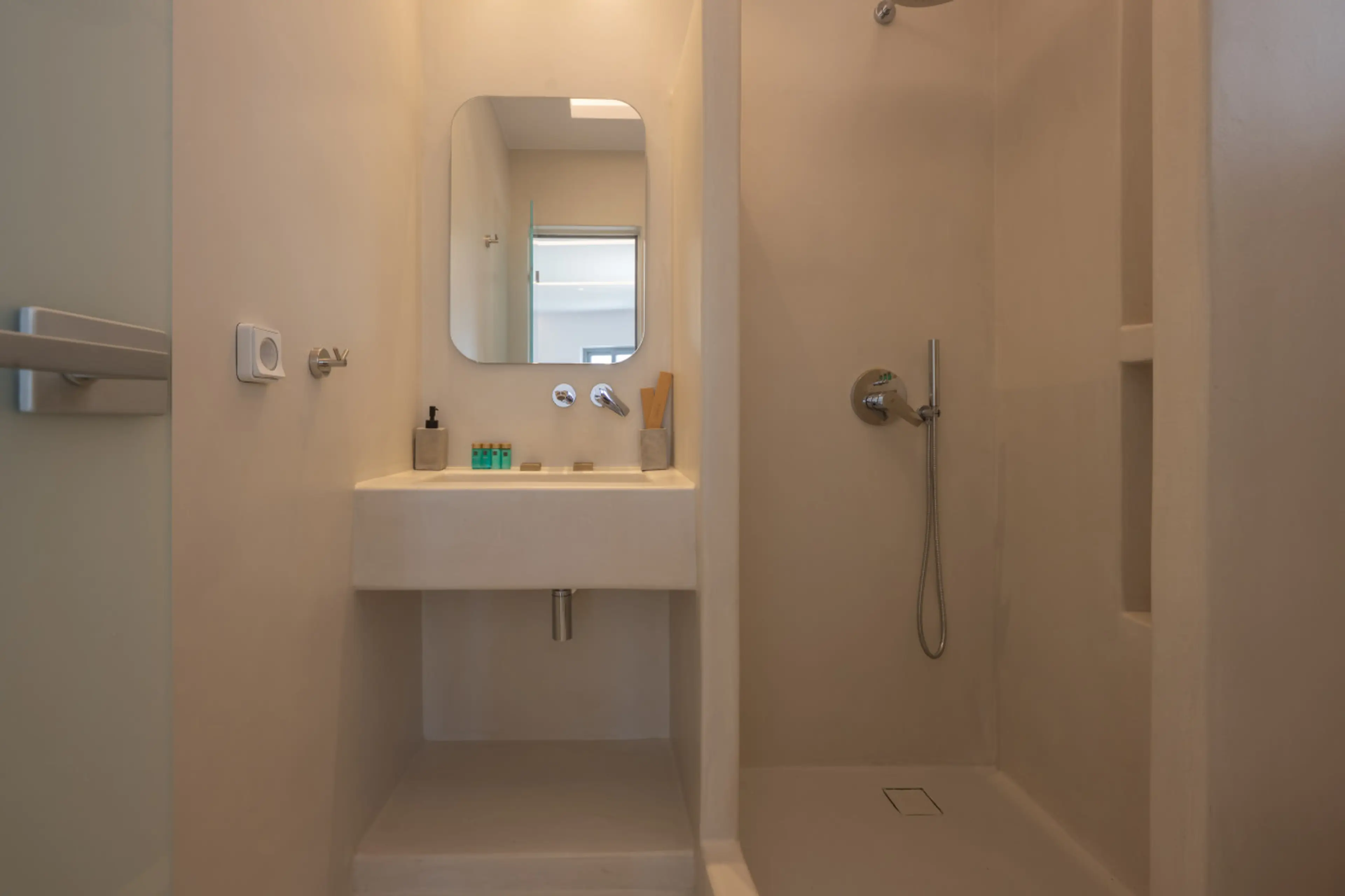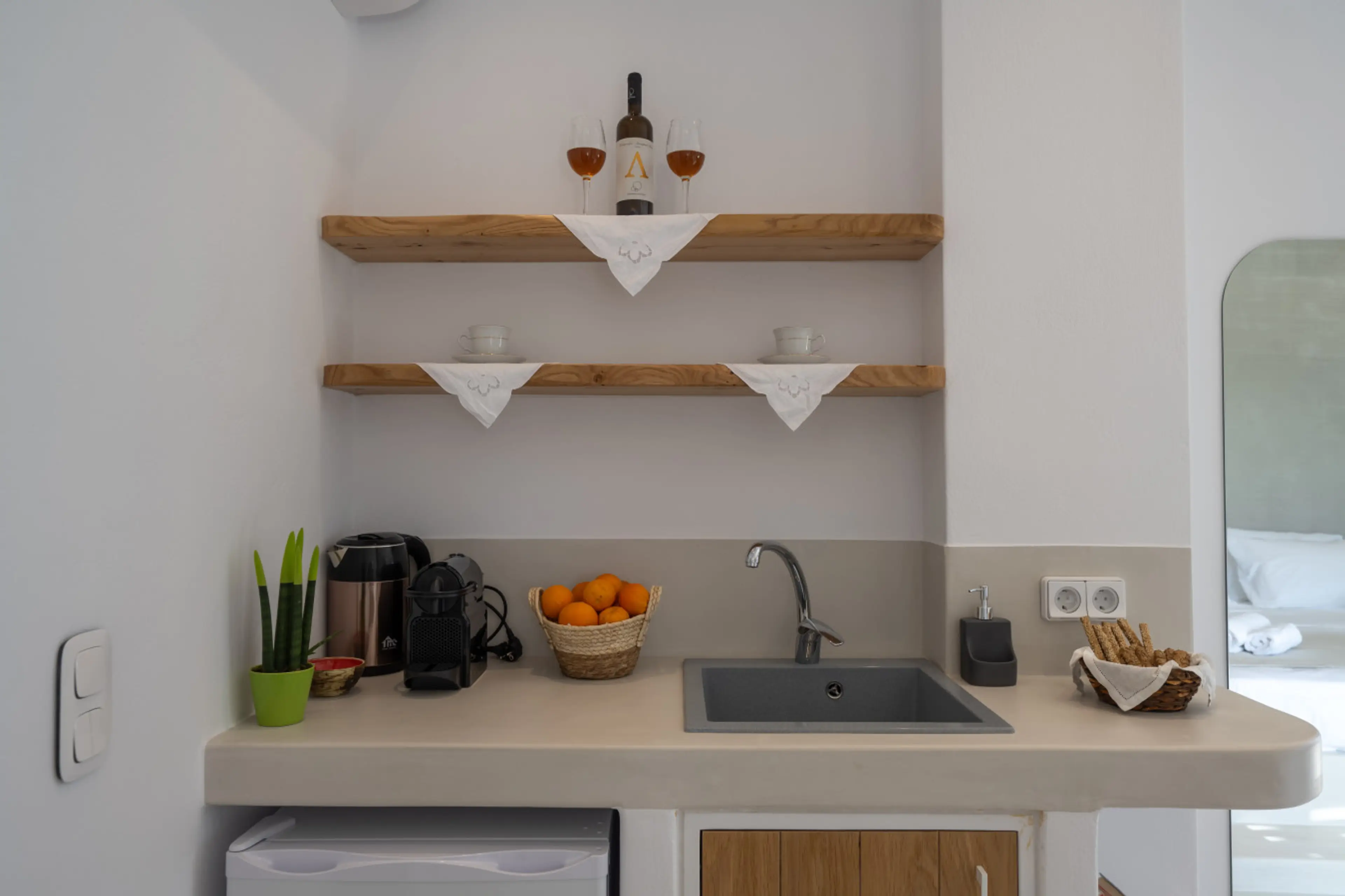 Une plage est accessible à pieds, et d’autres très belles (sable fin, eaux turquoises) assez proches en voiture. Une taverne (très bien) se trouve juste en face et un supermarché est à proximité. La piscine de l’hôtel est jolie, bien que peu abritée du vent (mais les propriétaires ont prévu d’y remédier). Les propriétaires sont fort aimables , discrets et très réactifs pour nous satisfaire. L’établissement est très propre et le ménage était fait chaque jour.